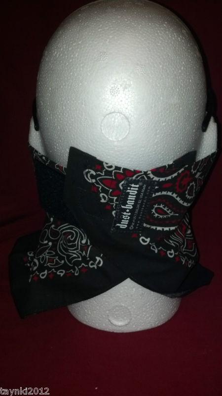 Camouflage Desert Digital Dust Bandit Face Mask - Lightweight cloth face mask with velcro closure. This face mask can be worn 3 different ways: As a face mask as shown, like a bandana, or like a hair wrap. Unisex. One size fits most. It's the ultimate protective bandanna, keeping dust, dirt, bugs and snow out of your nose, mouth and face when you ride. Dust Bandit® provides protection for riders of motorcycles, motocross, EnduroCross, all-terrain vehicles or snowboards. Large double-layered 100% cotton bandanna is sewn into the shape of a triangle and can be worn three ways: As a face filter mask; rolled up as a sweatband; or over the top of the head as a skullcap. A sturdy hook-and-loop closure system makes it easy to adjust the fit, even when wearing gloves. The benefits of owning a Dust Bandit®: Note: Black & Red Paisley Bandit photos for example of wear ONLY!
