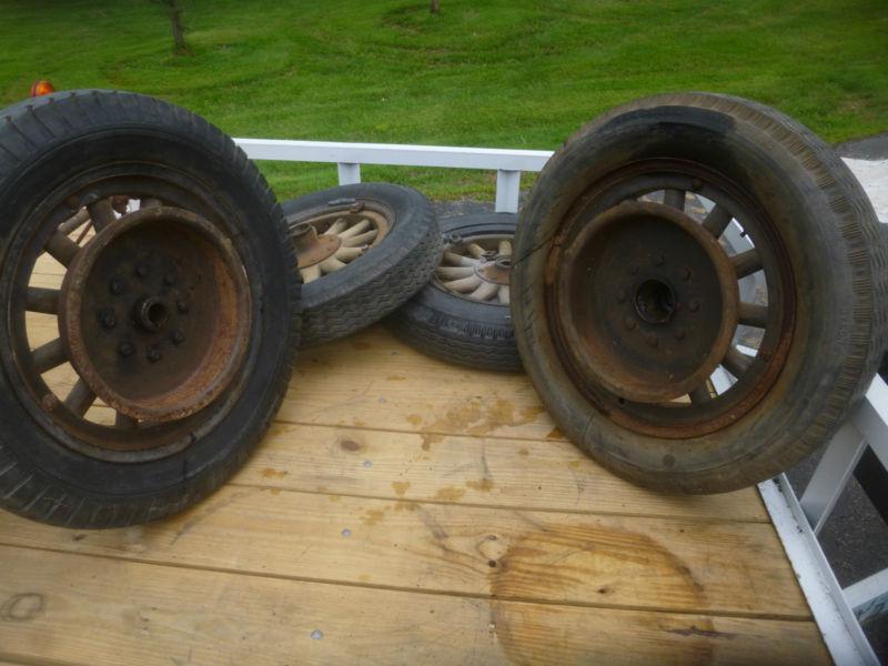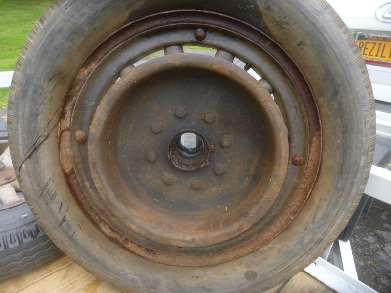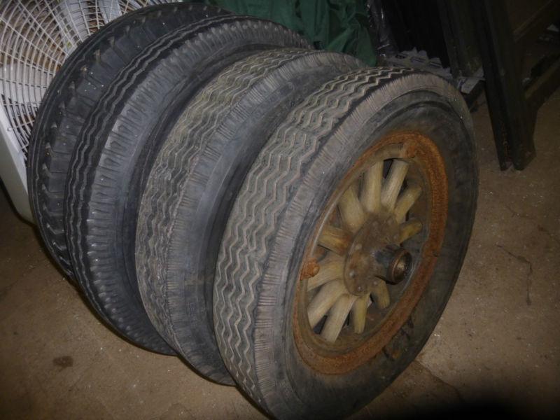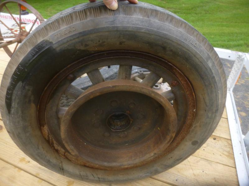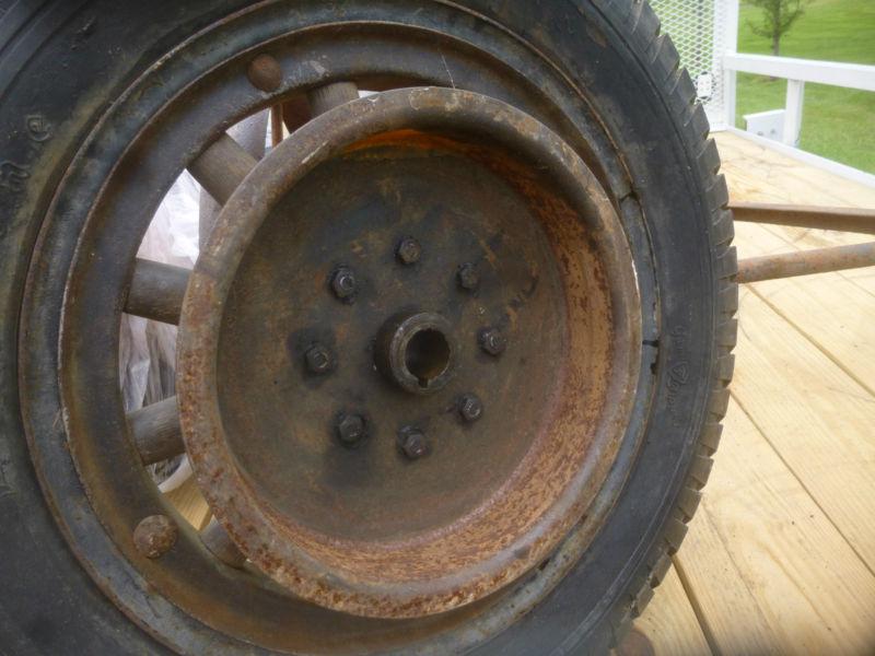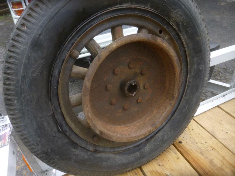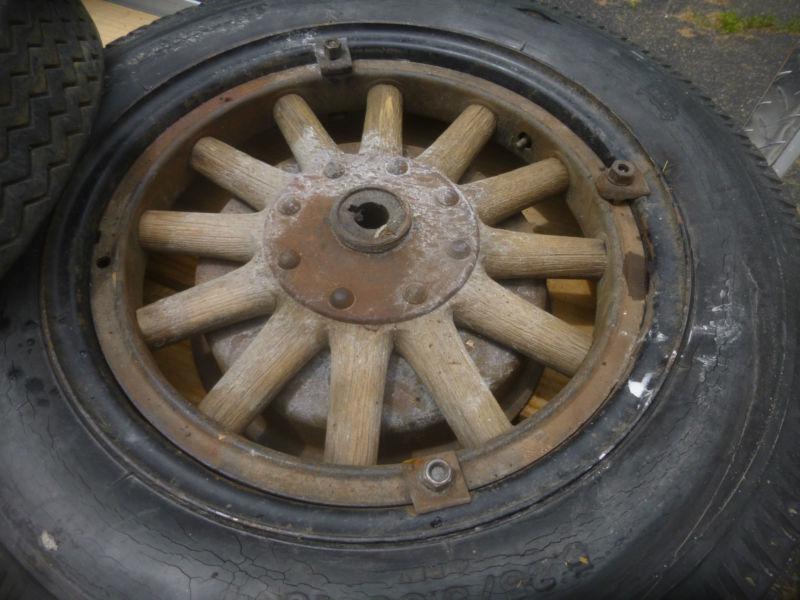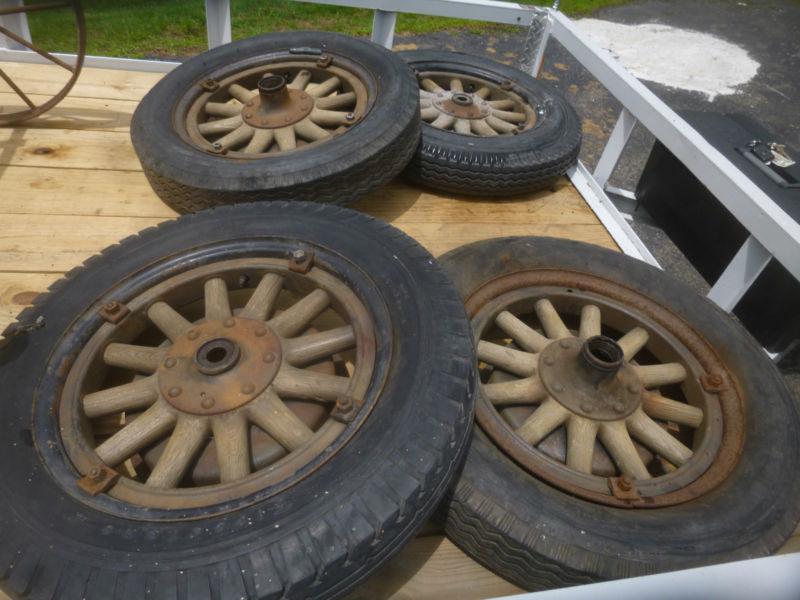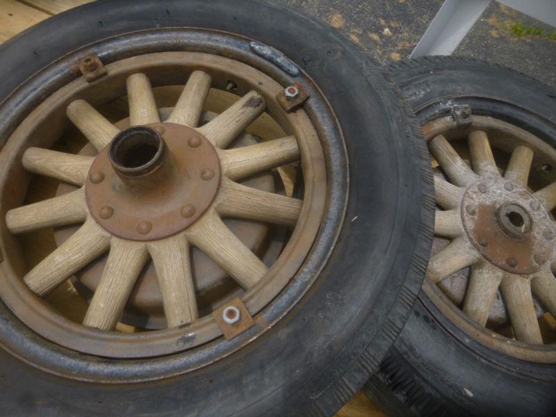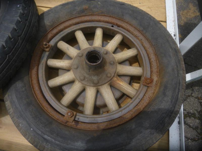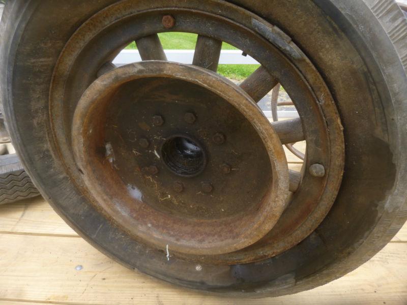 Early 1900's 18" Wooden Wheels. Not sure what vehicle it would go on. Wheels include the Rear Brake Drum As seen of photos.