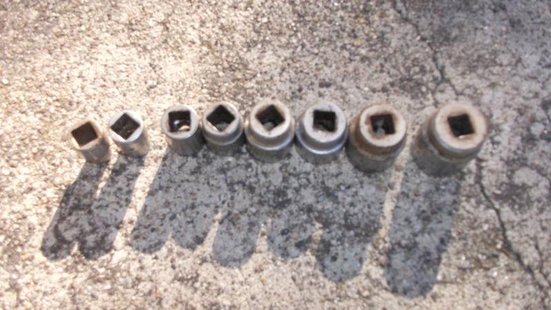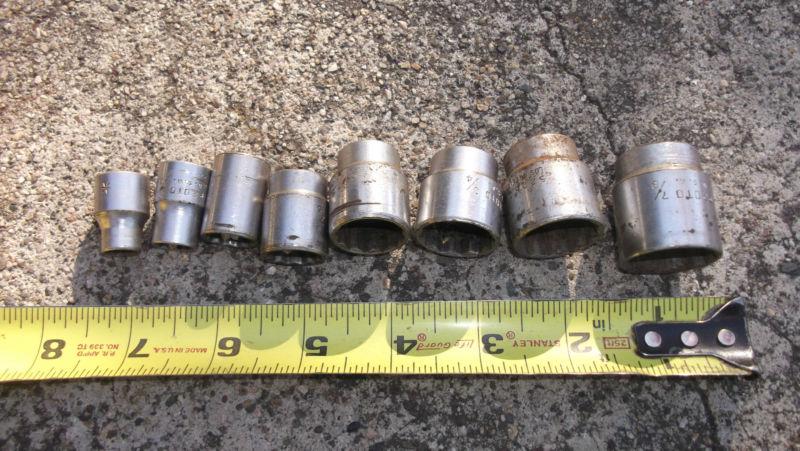 eight standard 12 point proto sockets 5/16 5210, 3/8 5212, 1/2 5216, 9/16 5218, 11/16 5222, 3/4 5224, 13/16 5226, 7/8 5228 all show use