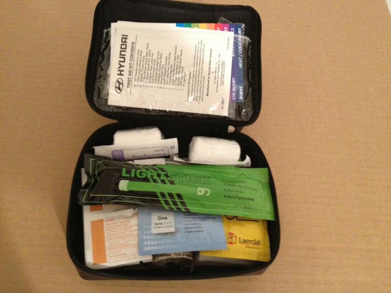 DON'T GET STRANDED ON THE SIDE OF THE ROAD WITHOUT ALL THESE ESSENTIALS!!! INCLUDED IN THE HYUNDAI ROADSIDE ASSISTANCE KIT IS AN EMERGENCY BLANKET, PONCHO, FIRST AID KIT, JUMPER CABLES, FLASHLIGHT, BUNGEE CORDS, ZIP TIES, TOOLS, GLOW-STICK, GLOVES,EMERGENCY WHISTLE, HEAVY DUTY 2 GALLON WATER BAG, TAPE AND RAGS ALL IN A PORTABLE CLOTH CARRYING CASE. BRAND NEW IN ORIGINAL PACKAGING GENUINE HYUNDAI MERCHANDISE. ALSO COMES WITH A BACK UP FIRST AID KIT IN LITTLE BLACK HYUNDAI BAG, (THE PICTURES ARE NOT AS IS) THE PICTURES ARE TO GIVE YOU AN IDEA OF EVERTHING YOU ARE GETTING. YOU ARE GETTING EVERTHING LISTED IN POST BUT THE HYUNDAI BAG I HAVE IS ALL BLACK WITH NO TAG (STILL EVERTHING IS NEW UNUSED) AND THERE IS A PIC. OF A SMALL FLASHLIGHT THAT I DON'T HAVE IN MINE BUT MINE COMES WITH A BIG 4 IN 1 LANTERN!!! 1-SPOTLIGHT 2-FLUORESCENT LAMP 3-BLINKING LIGHT 4-TABLE LAMP. HAVE ANY QUESTIONS JUST ASK, THANKS FOR LOOKING!!!