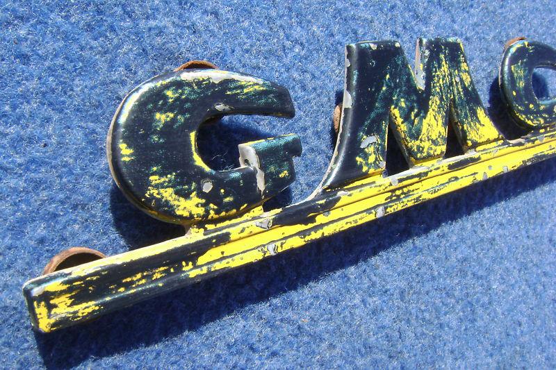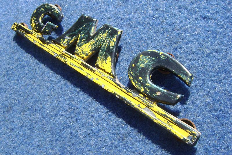 Original front nose emblem off of a late 40's-early 50's era GMC COE. This the flat emblem for the frt of the COE hood, not a curved emblem from a regular truck. There are no cracks, chips, or breaks in this piece. The original mounting hardware is still there. This piece will restore and refinish nicely or use as is for a rat rod. Rare, original piece selling as is.