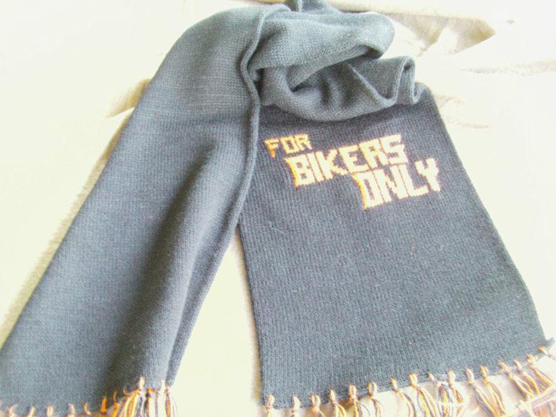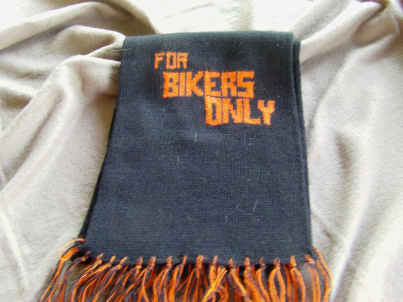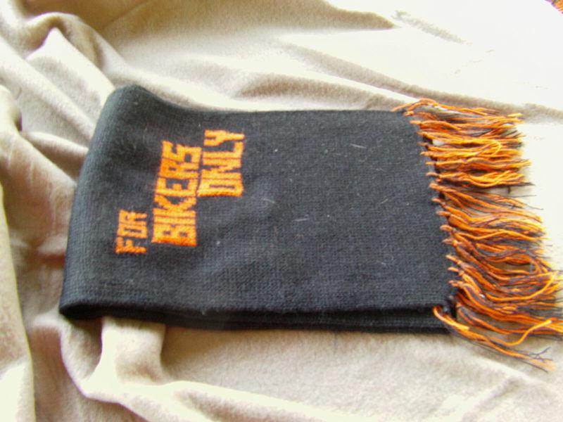 The "Bikers Only" in knitted into the scarf in orange