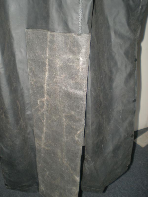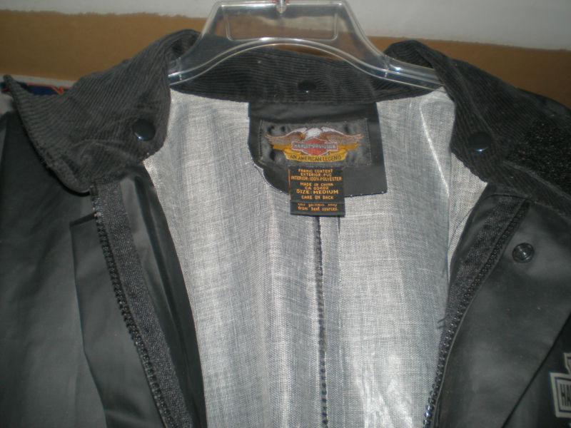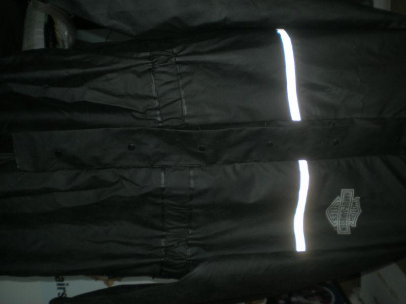 This is a pre-owned but in excellent condition one piece Harley-Davidson Rain Suit. There's some dirt on the front. The outside bottom of the legs have buttons. The waist has elastic. The front has a zipper and snaps. It has a reflective strip across the front and back. It's a medium. The length from top of the collar to the bottom of the leg is 66". The chest while laying flat from underarm to underarm is 27". The only thing it doesn't have is a hood.