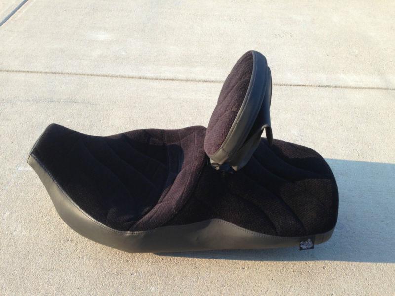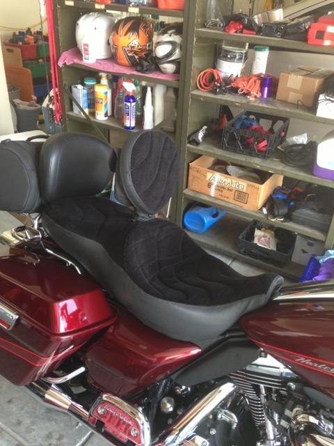 I have a like new Hartco "Pro Tour Saddle" that will fit all touring model Harleys from 2008 to present. This seat sells new with adjustable backrest for right at $700..go to Hartco's website and see for yourself!...It has a very comfortable velour type surface on it along with an adjustable backrest that has a pocket on the back for small item storage. This seat is extremely comfortable!...rider area is approx 16.5" wide, passenger area is approx 14" wide. I ship to the lower 48 states only. Paypal only..Fedex ship to your door.. This is a NO RESERVE AUCTION!!