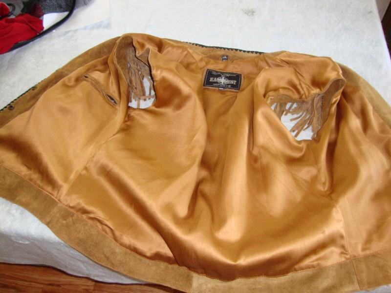 Buckskin suede Indian-style vest. Beautifully embellished with fringe, beaded medallions and leather braiding. Fully lined with a zipper interior pocket. Beautiful beadwork around the collar area. Front snaps closed all the way up to collar.