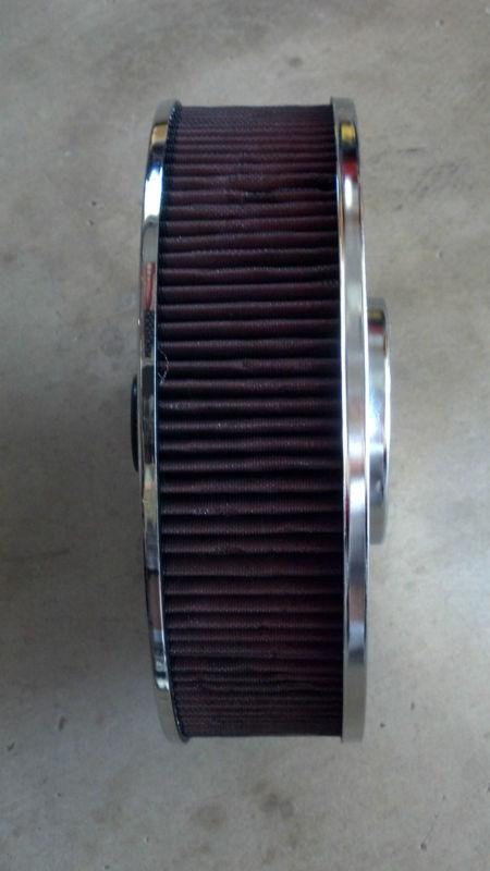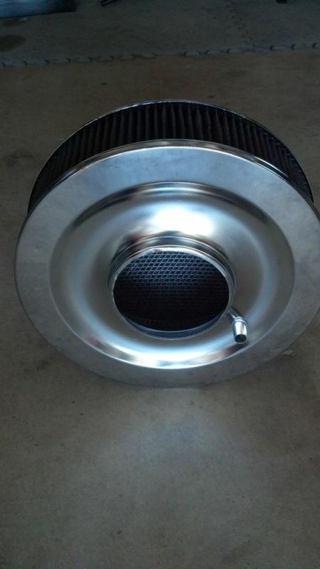 The Best Air Cleaner I could find, Used not abused for about 2 years. Chrome finish... freshly washed and oiled... ready to use... 4 x 14 inches , the base has the breather for the PCV valve hose... fits a four barrel carb. It will ship as soon as payment is in my PayPal account. It will be wrapped in plastic and boxed up. 120.00 plus shipping from 92307, thanks for looking.
