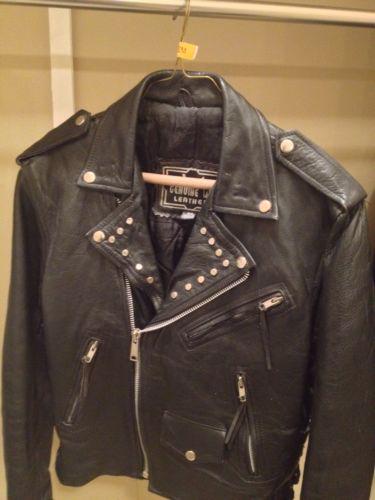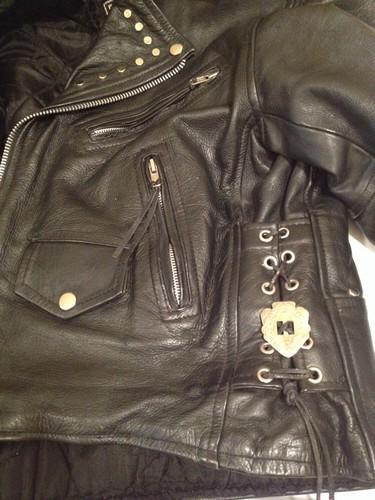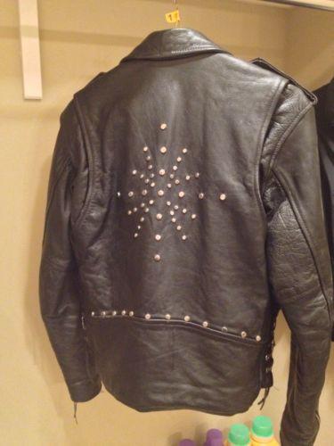 Custom black leather motorcycle jacket. No wind will get through this jacket...it's thick & durable! Quilted liner inside keeps you warm & custom studding on outside keeps you stylish!