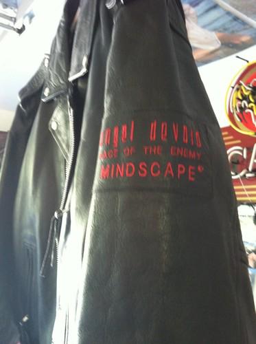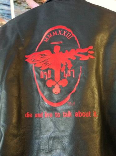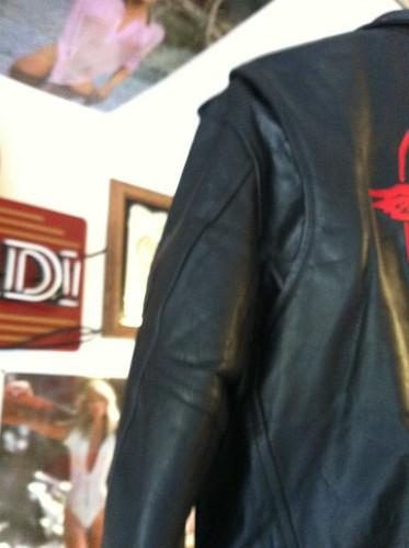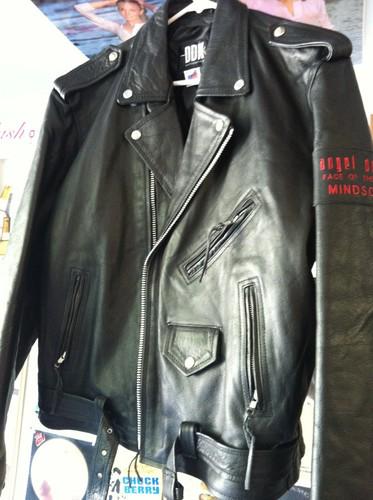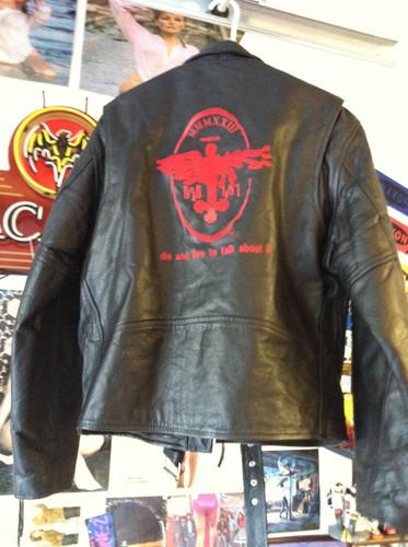New never worn leather jacket. It was won in a contest raffle. Real nice sewn on graphics representing an adults violent video game. Nice heavy jacket. 25 inches collar to waist. 24 inches pit to pit.