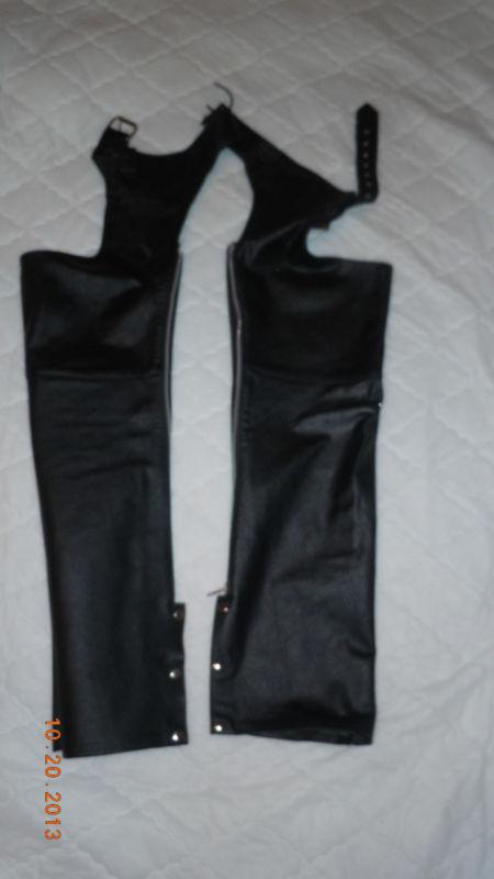 Leather motorcycle chaps, no tears, zippers operate, never worn, size small
