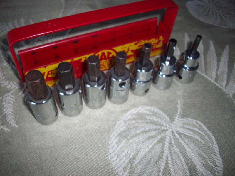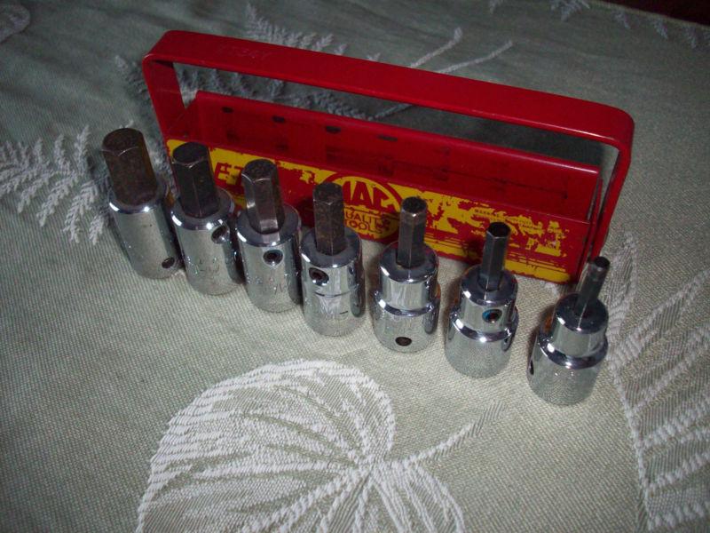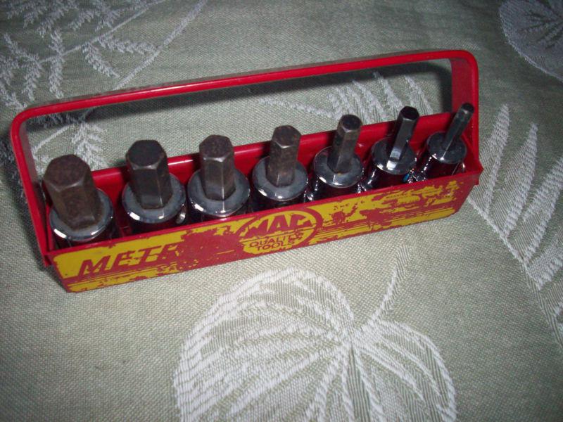Up for auction/sale is a 7 piece Mac Tool 3/8" drive Metric Hex Driver Set w/Case. The set includes sockets from 4mm to 10 mm and uses premium grade steel alloys paired with advanced forging methods. Technical heat treatment and tempering for lasting durability and proprietary 3-step nickel chrome plating process for high polish superior corrosion resistance and easy tool clean-up. Sockets in set include the 4mm, 5mm, 6mm, 7mm, 8mm, 9mm, and 10mm.