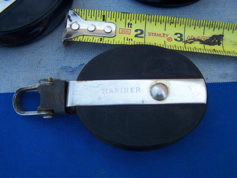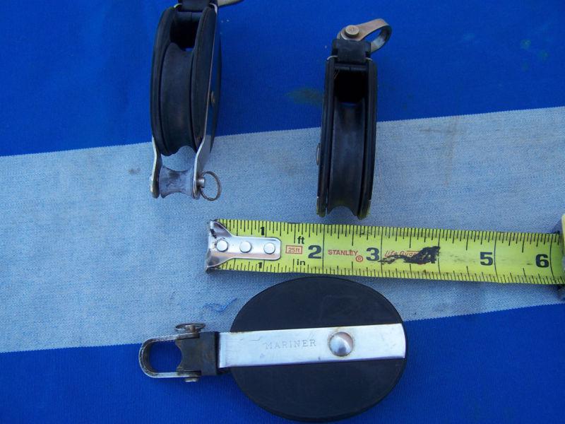Mariner Sailing blocks. Single blocks, one with becket. One block has a small crack, the pen is pointing it out in picture 4. Good working condition.