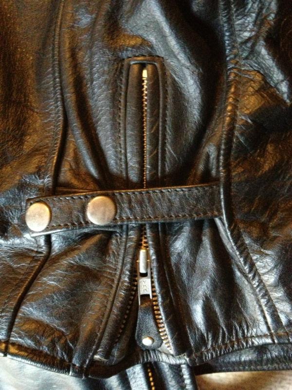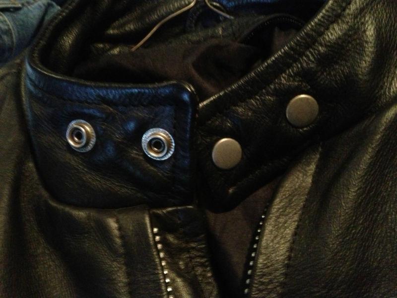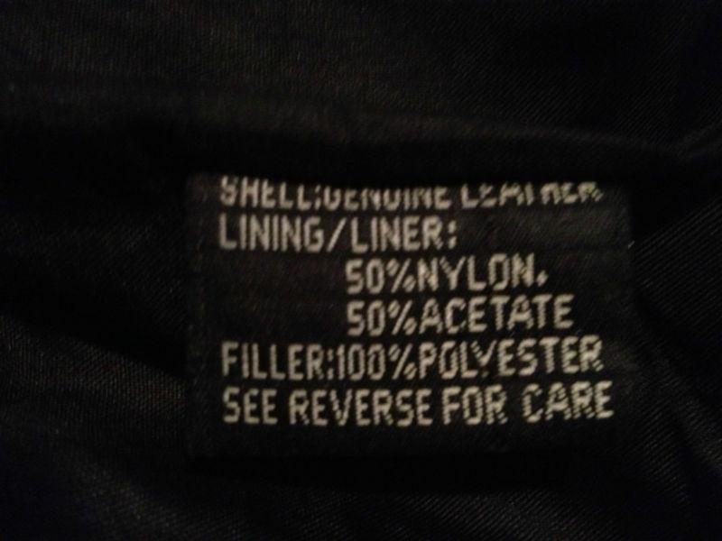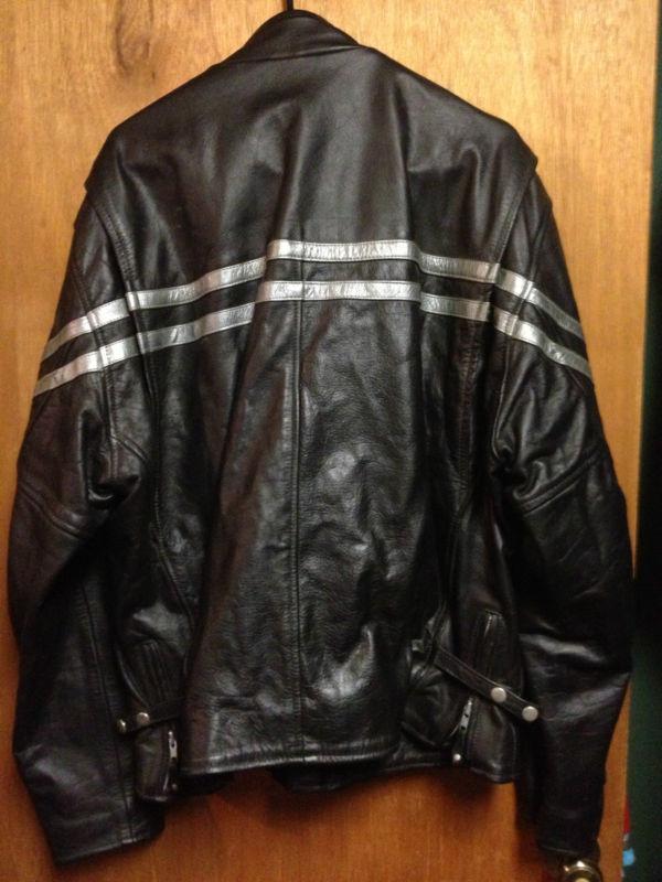 You are looking at a Pre-owned Excellent Condition Men's Black and Silver Leather Riding Jacket - Genuine Leather Shell - Size 46 (Large/X-Large) - Full Zip - Two front zip pockets - Adjustable sleeves with zips and snaps - snap top - NICE! Only worn two times - Lining is 50% Nylon and 50% Acetate - Filler is 100% Polyester - Buyer to pay $12.00 USPS shipping and handling. It has some tiny little places/chips on the outside but nothing major - they are barely noticeable. Check out my other auctions - we are selling all of our Harley Davidson clothes and accessories - I will combine shipping for $2.50 each additional item. Thanks!