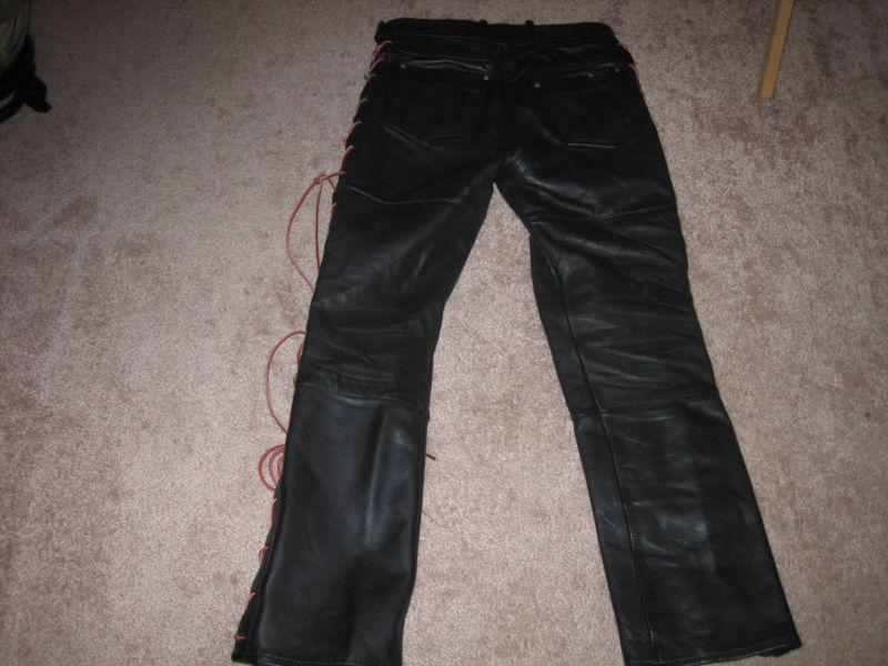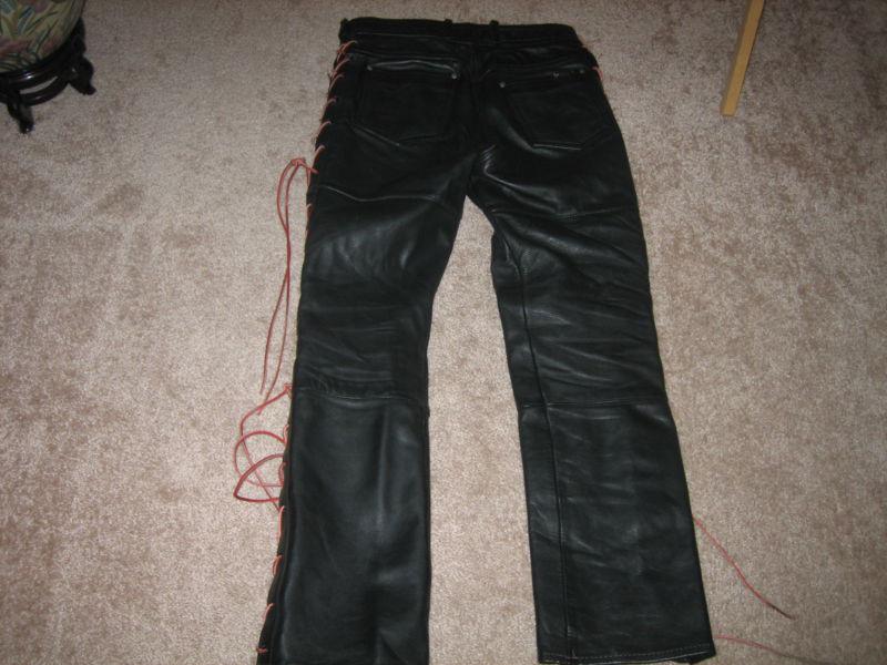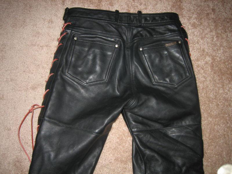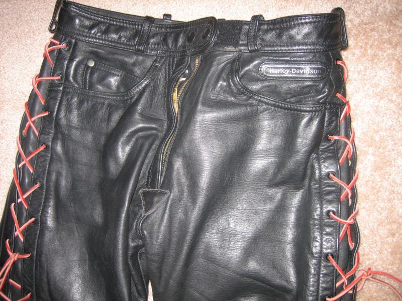 AUTHENTIC HARLEY DAVIDSON PANTS WITH CRISSCROSS RAWHIDE ON SIDES. CAN CHANGE IF DESIRED. MADE IN THE USA, AND SIZE 12. GOOD CONDITION. BLACK LEATHER, GOOD ZIPPER AND POCKETS. BACK OF PANTS HAS EMBLEM