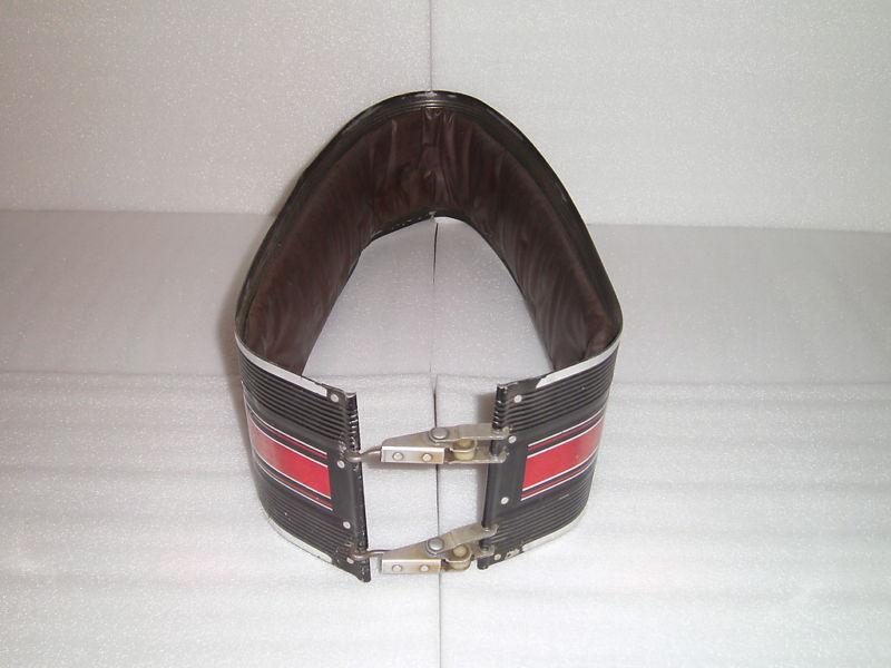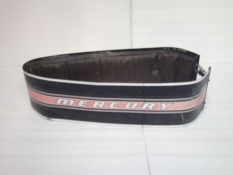 One used Mercury Outboard Motor wrap around cowling. This one has a red and silver stripes back is printed 350. The height is 6" tall, lenght front to back is 21". Both front latches are in good working condition. Inside padding is in good condition no rips. Shows what I call normal wear scratches does have a few spots bent out of shape. Those could be bent back nothing bad. It may look out of shape in the picture but with out being attached to a motor there is nothing to hole it in shape.