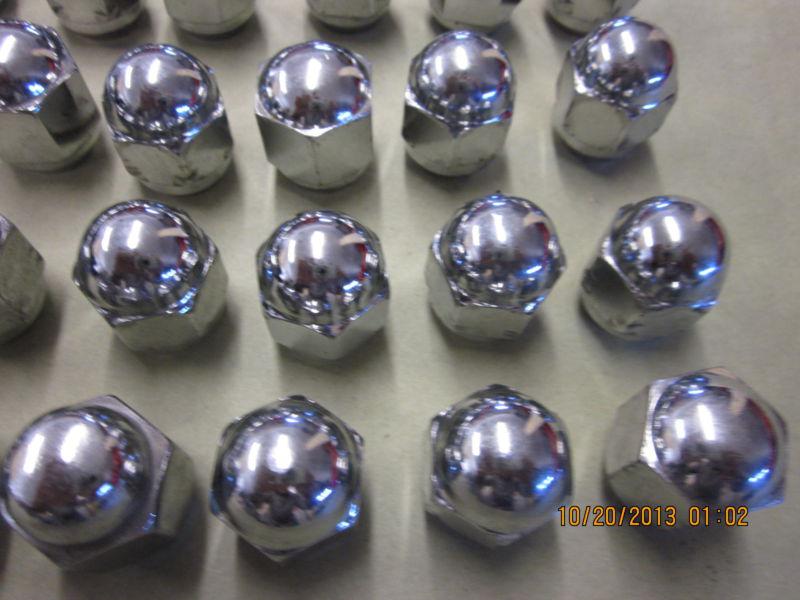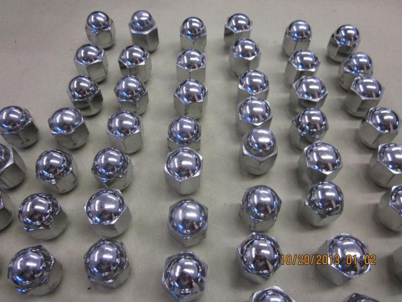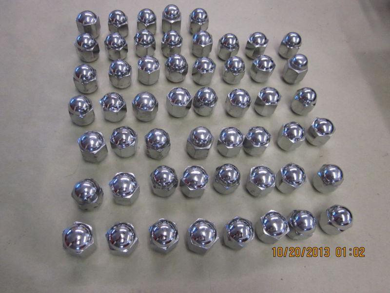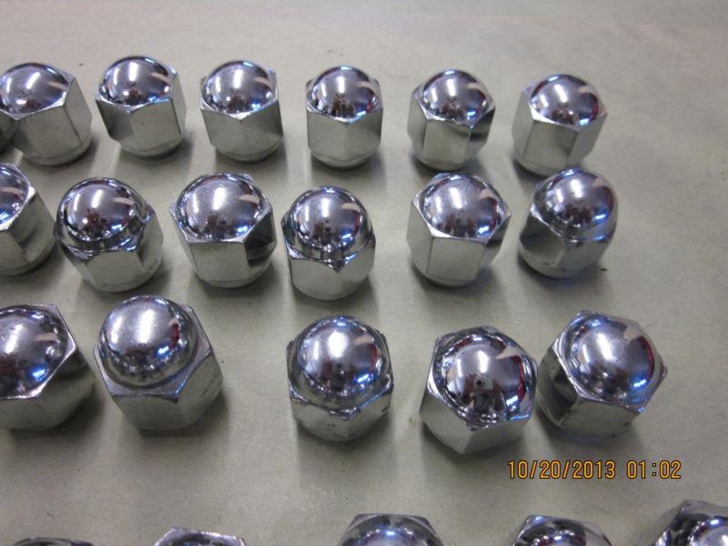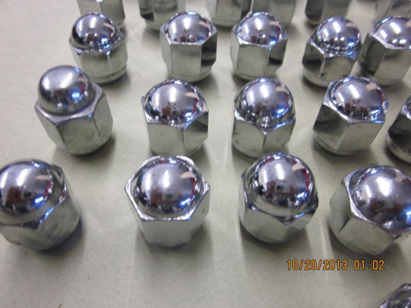 UP FOR BID IS A LARGE LOT OF USED CHROME PLATED LUG NUTS FOR A MODEL A FORD. THERE IS 53 IF I COUNTED CORRECTLY. SOME OF THEM HAVE SOME SMALL AMOUNT OF LUG WRENCH SCARING AND OTHER I CAN'T TELL IF THEY HAVE EVER BEEN USED. I HAVE CHANGED THE A WHEELS ON MY CARS TO MODERN WHEELS AND THESE USE DIFFERENT NUTS. SOLD AS IS.
