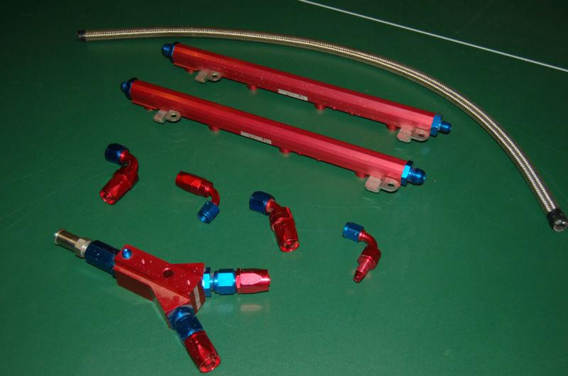 Ford Mustang MotoBlue red anodized fuel rail kit.