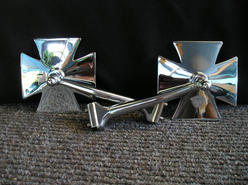 NEW PAIR OF MALTESE STYLE STRAIGHT ARM SIDE VIEW MIRRORS ! MIRRORS ARE MOUNTED ON TO THE DOORS EDGE ! COMES READY TO INSTALL ! NICE LOOKING DRESS UP ITEM ! WE ALSO SHIP INTERNATIONAL ! BUYER PAYS SHIPPING/HANDLING COST $ 9.00 ! WE OFFER SHIPPING DISCOUNTS ON MULTIPLE ITEMS !