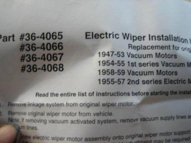 UP FOR AUCTION IS A NEW IN THE BOX, NEVER INSTALLED, ELECTRIC WINDSHIELD WIPER CONVERSION KIT FOR A 1958-1959 CHEVY TRUCK WITH VACUUM OPERATED ORIGINAL WIPERS. THIS KIT IS COMPLETE WITH MOTOR, WIRING HARNESS, NEW SWITCH AND INSTRUCTIONS. BID WITH CONFIDENCE...,NO RESERVE.