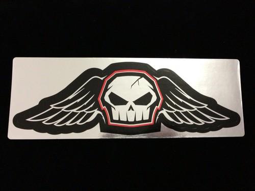 Sticker size is approximately 8 in. x 2.5 in. (Skull wing shape). The whole sticker (rectangular shape) is approximately 8.5 in. x 3 in.