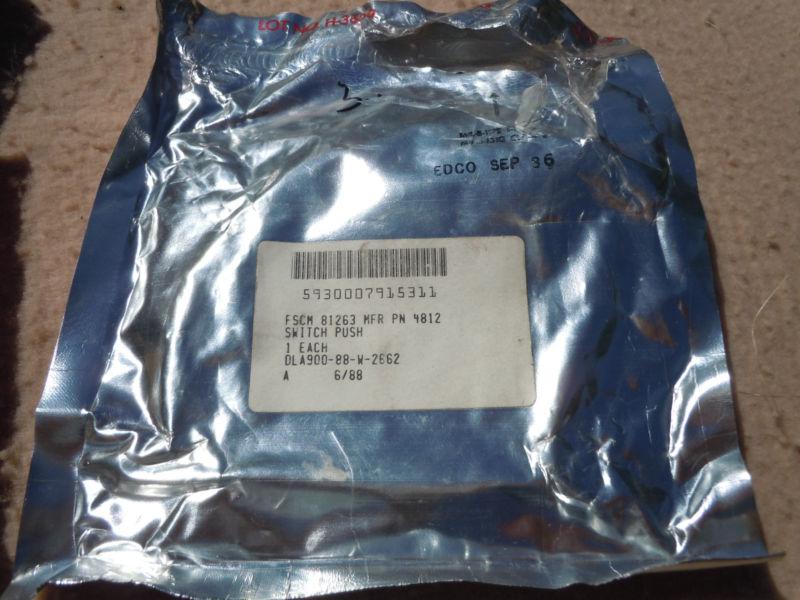 THIS AUCTION IS FOR ONE (1) "NOS" MILITARY "PUSH" SWITCH IN ITS ORIGINAL OPENED PACKAGING. THE SWITCH WORKS VIA A SPRING LOADED BUTTON. THE SWITCH HAS A "PACKARD" CONNECTION ON THE BACK. THE SWITCH IS MADE BY THE DOUGLAS MANUFACTURING DIVISION. THE PART NUMBERS ON THE SWITCH ARE 4812 AND 8389470. PACKAGED 6/88.