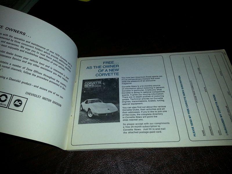 NOS 1974 Corvette owners manual first edition. I ordered these from Helms every yesr when the cars came out. It is In Mint NOS condition. I am selling off my collection getting old, see my other listings? 540 845 0960