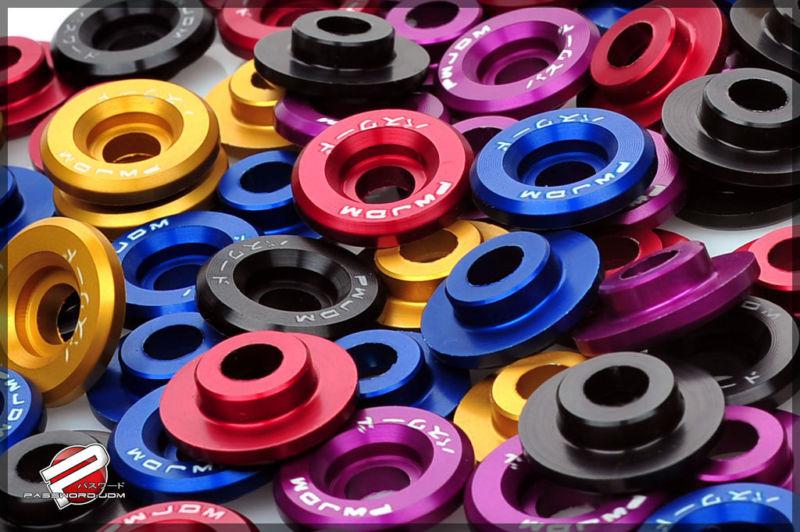 Add that last finishing touch to your engine bay with these all new Password:JDM Valve Cover Washers! Offered in anodized black, blue, gold, purple, and red, these valve cover washers feature the Password:JDM Kenji logo. All Password:JDM fender washers are constructed from aircraft grade aluminum and are matched up with long lasting stainless steel bolts.