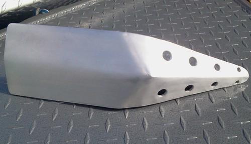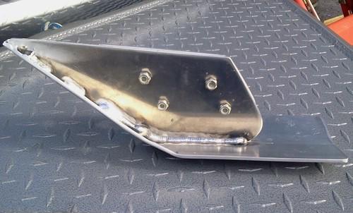 Handmade from lightweight and strong .160 thickness 5052 marine aluminum alloy. Comes with stainless bolts and nuts. 4 inches wide at back. 8 inch long bottom gravel guard. 8 inch long front deflector plate. Pulse MIG welded.