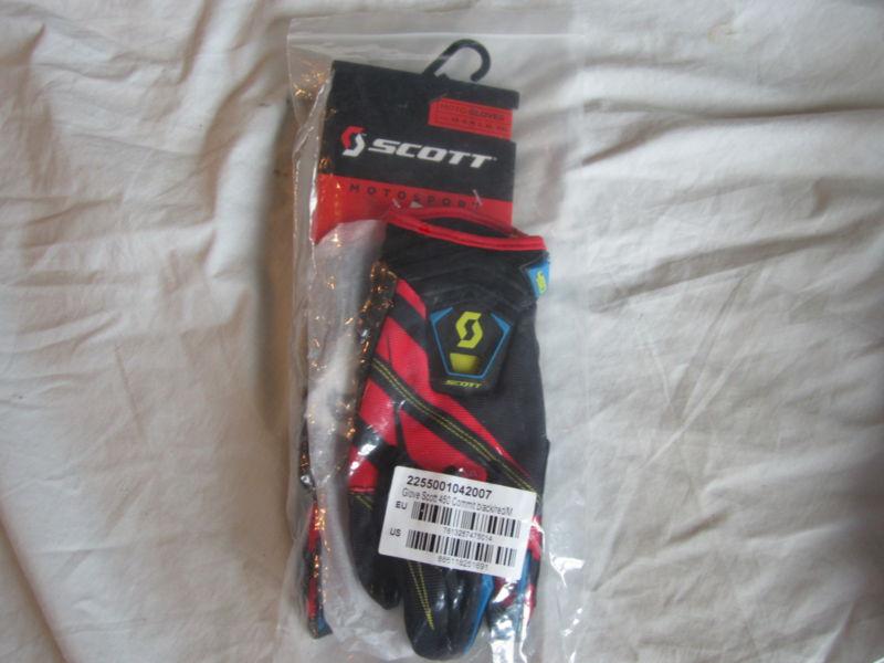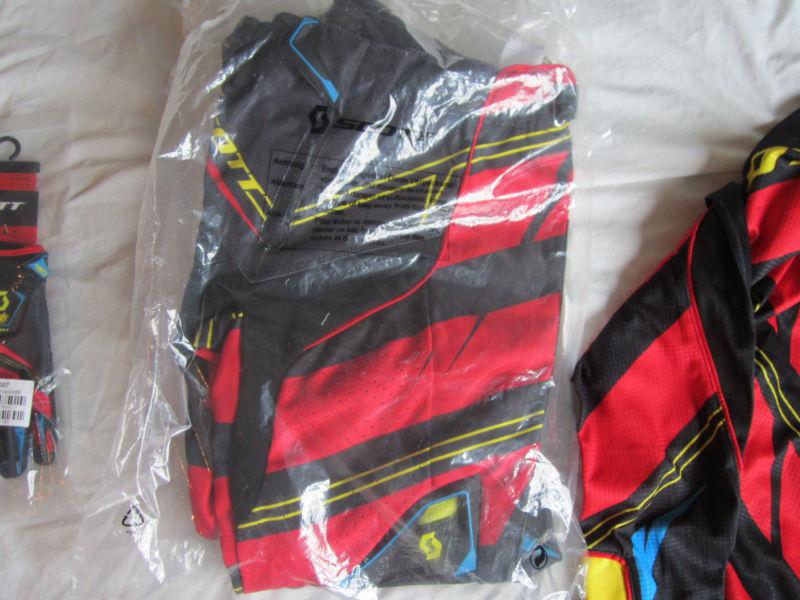 Mens Scott Motocross gear. New in package. 450 Commet black/red. Gloves Medium. Pants 30. Shirt Medium. Black and red with some blue and yellow.
