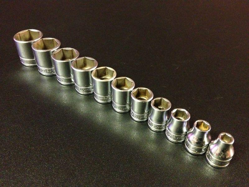 This is a nice used 11pc set of Snap-On Tools 3/8" 6pt SAE Shallow Sockets. All these sockets are the older underline logo, & are in pretty nice shape for there age. There are no engravings on any of these sockets. Please feel free to ask any question.