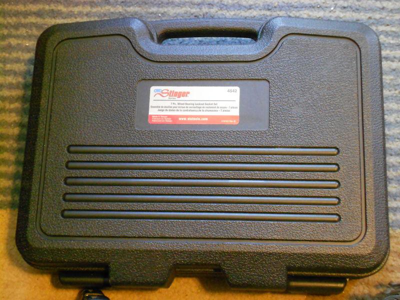 For use with 1/2" ratchet or breaker bar. Set contains: No. 519097-7 – 55 mm hex lock nut socket designed for use on front wheel adjusting nuts found on Toyota models FJ, LN, and RN. No. 519097-1 – 2-3/8" hex lock nut socket works on 1984–92 Ford Rangers and Bronco IIs with automatic locking hubs. Similar to Ford No. 205-040 (T70T-4252-B). No. 519097-3 – 2-1/2" hex lock nut socket fits the hex nut found on rear axles and various front axle applications on light-duty trucks. No. 519097-5 – 2-1/2" rounded hex lock nut socket works on 1995–96 Ford F-150 trucks and full-sized Broncos with automatic locking hubs. Similar to Ford No. 205-348 (T95T-1197-A). No. 519097-4 – 2-3/4" rounded hex lock nut socket works on 3/4-ton and 1-ton Ford F-250 and F-350 trucks with automatic locking hubs. Similar to Ford No. 205-349 (T95T-1197-B). No. 519097-2 – 2-9/16" rounded hex lock nut socket works on 1990–93 Dodge trucks with Dana 60 manual hubs. No. 519097-6 – 2-3/8" rounded hex lock nut socket works on 1990–newer Ford Rangers, Bronco IIs, and Explorers with automatic locking hubs.