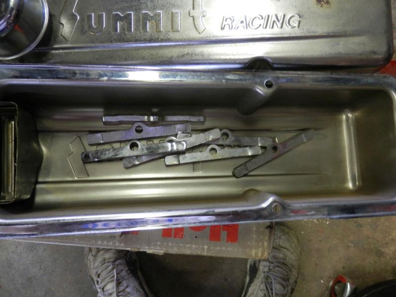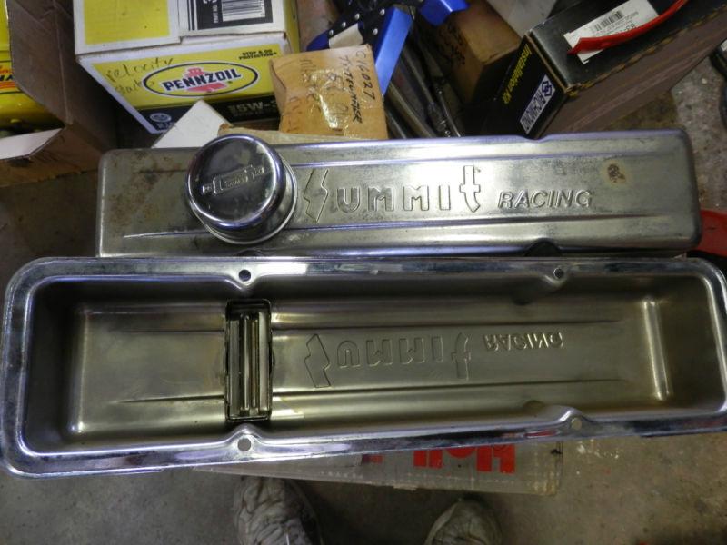 This is a set of Summit Racing Chevrolet small block V8 chrome stamped steel valve covers. The are both baffled and have the grommets installed with breathers. They are used, and chrome plated, but there is some surface rust on the chrome. They could use some chrome polish to bring back a nice shine. There are also 7 hold down tabs included with covers