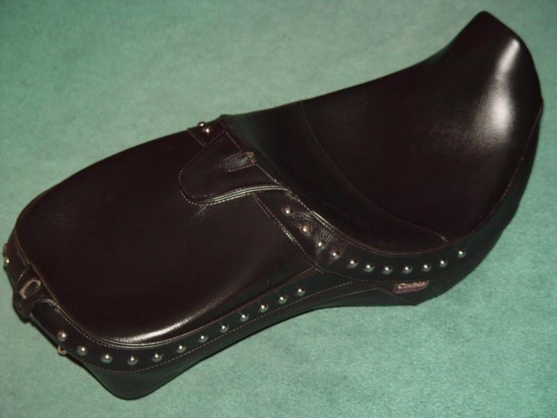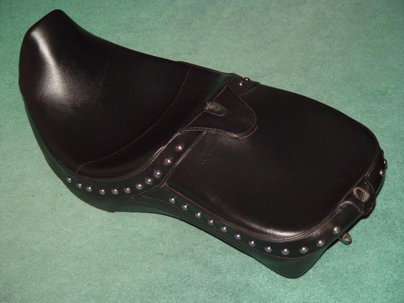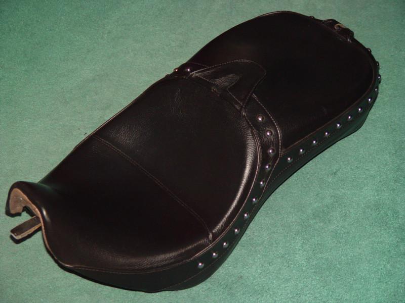 NEARLY NEW! CORBIN DUAL TOUR SADDLE for HARLEY SOFTAIL DEUCE 2000-2007 in BLACK LEATHER with CHROME STUDS! Dress up your favorite bike now! This Seat is in Great Shape in BLACK LEATHER with CHROME STUDS as shown in the pictures... Fits ONLY HARLEY SOFTAIL DEUCE 2000-2007, including FXSTD, & FXSTDI models. This CORBIN DUAL TOUR Saddle provides exquisite looks combined with maximum comfort for two! This model offers two ergonomically sculpted seating positions that maximize the available seating area on your bike. The generously contoured platforms provide better weight distribution to eliminate pressure points and give long range support. * We also have available 1 CORBIN HOLLYWOOD SOLO SADDLE in BLACK LEATHER for HARLEY SOFTAIL DEUCE 00-07 - Contact us if you'd prefer the L@@K of a HOLLYWOOD SOLO SADDLE on your SOFTAIL DEUCE! This Great Seat completes the custom look you are striving to achieve!! This saddle provides MAXIMUM COMFORT for the RIDER, with its UPSLOPE DESIGN - BACK SUPPORT! Also provides comfortable Seat for PASSENGERS! - while maintaining a SLEEK PROFILE! This SADDLE is SCULPTURED to follow the smooth contours of the Harley Softail for MAXIMUM VISUAL APPEAL! I installed a Corbin DUAL TOUR seat on my Cruiser this year and it is the most comfortable saddle I have ever experienced! What a great look! Easier to reach the ground also! Don't let this hard to find item get away! Our Last One! Will distinguish your ride...the Best Never Rest! Dress up your bike now! CORBIN Genuine Part# DUCE-DT... with No scratches, No defects, No dirt spots, No imperfections as shown in the pictures! This Seat completes the custom look you are striving to achieve! & It looks great! This saddle provides maximum comfort for the RIDER and features a padded and upholstered tail section that is capable of taking passengers for long rides! Corbin's DUAL TOUR SADDLE design for the Harley Softail DEUCE 2000-2007 provides an extremely comfortable solo ride combined with a wide seating area for your Lady. Designed to give your bike a stylish hotrod look and still give you good riding range. The stylish tail section creates a nice amount of back support in the rider's area. Saddle measures 29 inches long and 14 1/2 inches wide - Passenger section is a comfortable 13 inches wide! (She'll Love 13 inches!) Includes a SUPPORT MOUNT for RIDER'S BACKREST & SUPPORT MOUNT for PASSENGER'S BACKREST, concealed beneath the velcro attached double Leather Flaps! (Backrests not included, but can be added!) JUST SLIP IT IN! We have 2 CORBIN BACKRESTS with CHROME STUDS in Stock which perfectly MATCH this SADDLE!! Can be used for extra COMFORT and BACK SUPPORT for the RIDER and/or the PASSENGER! (Let us know if you want to purchase the MATCHING BACKREST(s), and we will add it to the invoice before you complete payment!) This SADDLE is Top-Notch! The beauty of this saddle is the fact that BOTH the RIDER and PASSENGER RIDE in Comfort and this SADDLE ENHANCES YOUR RIDE!! SHARP LOOKING!! PIMP YOUR RIDE!! This seat provides a platform that offers an increased area of body contact to give excellent weight dispersion and eliminate hot spots. Neutralized to curb the tendency to slide in the saddle which will greatly reduce fatigue. The shaping of the Corbin saddle relieves centralized pressure and supports from the sides. Corbin builds the saddle up with high-density foam for a firm, supportive ride that lasts. This Dual Tour Saddle is built contoured to the bike and supported by 10 rubber mounts which contact the bike. The entire saddle touches your bike ONLY with rubber bumpers to protect your paint job. Provides a perfect fit and contours the crown and profile of the fender. To install this saddle, you slide it forward, there is a leather covered tongue which slides under the receiver on the bike, the seat rests on 10 rubber mounts to protect your paint, and you tighten a single bolt in the rear. This CORBIN DUAL TOUR SADDLE is a GREAT CHOICE if you are looking for SHARP LINES and COMFORTABLE RIDES! It is a Seat for COUPLES RIDING TOGETHER...for several reasons: This Corbin Dual Tour Saddle offers excellent Rider comfort with a comfortable Passenger section for a great combination of Comfort and Style! The generously contoured platform provides better weight distribution to eliminate pressure points and give excellent support to the Rider...Also accepts a removable Rider's Backrest and Passenger's Backrest for maximum back support (not included, but can be added.). Rider's Backrest Slot and Passenger's Backrest Slot are Built into this Great Seat, and hidden under velcro attached double Leather Flaps. The BACKREST is fully adjustable for a tailored fit to the Rider's or Passenger's posture. This saddle is Top-Notch! The beauty of this saddle is the fact that the Rider has great back support due to the upslope design, and there is padded room for Passengers! This is the MOST COMFORTABLE SADDLE for the LADY RIDING BEHIND YOU!! STOP HER FROM COMPLAINING!! WE'RE TIRED OF IT! BUY-IT-NOW!! This CORBIN DUAL TOUR SADDLE for HARLEY SOFTAIL DEUCE 2000-2007 in BLACK LEATHER with CHROME STUDS List Price is $549