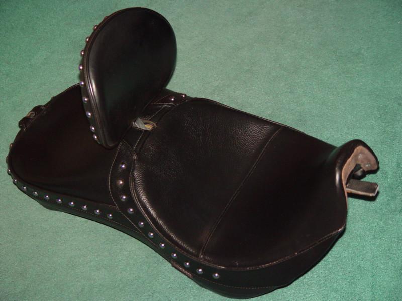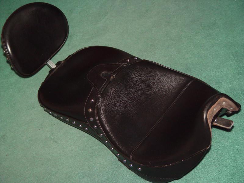 Awesome! Save $$$ now! Will add class and distinguish your ride...the Best Never Rest! PIMP YOUR RIDE!! Why order it from someone else, and wait weeks for delivery??? Don't Bid unless you intend to Pay! High bidder pays Shipping and Handling fee of $30.00 within US. We accept multiple Payment Methods, within 5 days. PLEASE CHECK OUR OTHER LISTINGS FOR ADDITIONAL CUSTOM BIKE PARTS! ___________________________________________________________________________________ Responding to requests, we have added 2 photos to our listing which shows one available Matching CORBIN STANDARD SOLID BACKREST in BLACK LEATHER with CHROME STUDS (11"wide x 9"high) which can be purchased in addition to this Superb CORBIN DUAL TOUR SADDLE for HARLEY SOFTAIL DEUCE 00-07, first in the RIDER position, then in the PASSENGER position! - THIS CORBIN BACKREST PERFECTLY MATCHES THIS SADDLE! CAN BE MOUNTED FOR THE RIDER AND/OR THE PASSENGER! ABSOLUTELY TOP-NOTCH!! This CORBIN DUAL TOUR SADDLE includes a BACKREST SUPPORT MOUNT for the RIDER and a BACKREST SUPPORT MOUNT for the PASSENGER, concealed beneath the Double Leather velcro-attached Flaps. The addition of a BACKREST increases the level of Comfort for the RIDER and your LADY, and Helps Keep Her On the Bike when You Punch the Throttle! (She'll appreciate that!:) It eases the tension in your Back, Arms, Wrists, and Hands! It also helps increase Control when Tooling Through the Tight Turns! That is because you have Greater Control with Support half way up your Back. You can mount it in either the Rider or Passenger Position, and it can be moved in just a few minutes with the aid of 2 Allen Wrenches! You also can attach a Travel Pack for long trips. I can fit more in my Travel Pack than I can in both my Hard SADDLEBAGS combined! Winning Bidder can purchase their choice of Matching CORBIN BACKREST(s) in BLACK LEATHER and a Travel Pack to complete the package! This CORBIN DUAL TOUR SADDLE is much more Comfortable than the stock seat! We are sure You Will Be Pleased!