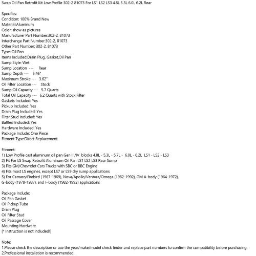 Swap Oil Pan Retrofit Low Profile 81073 For Ls1 Ls2 Ls3 4.8 5.3 6.0 6.2l Rear #9 on 2040-parts.com