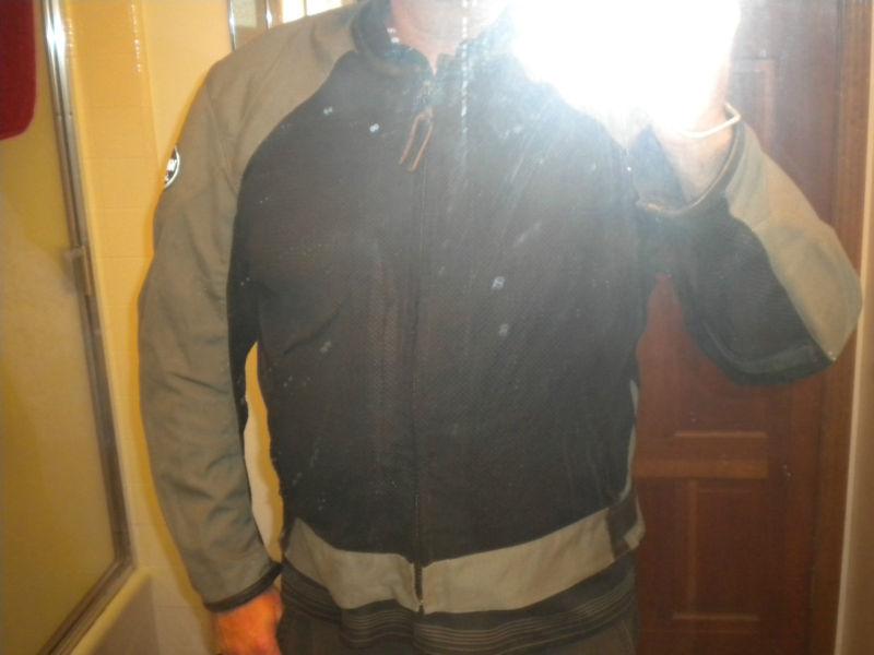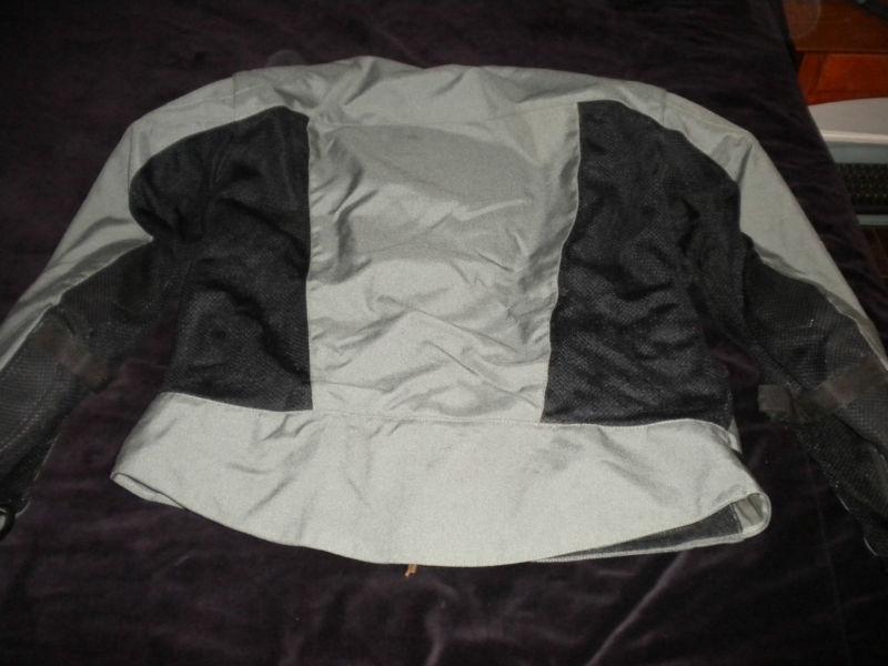 Gray and black, size XXL. I usually wear an XXLT, and I find this jacket to fit perfectly. "CE" rated armor pads in shoulders, elbows, and down the spine. Velcro adjusters for waist circumference. Patches on shoulders made of reflector material. Zippered outer pockets. Non-zippered mesh pockets inside front of jacket for gloves. Zip-out liner made of heavy windbreaker material.