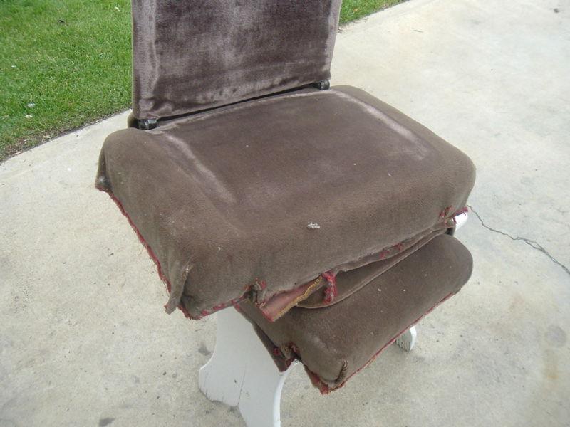 These vintage limosine jump seats were removed and stored a long time ago. Actually pretty decent and covered in brown mohair. No attaching hardware is included. Heavy, weigh 20 plus pounds aoiece. Cushions are 19" by 13 1/2" and backs 14" by 13". Thank you.