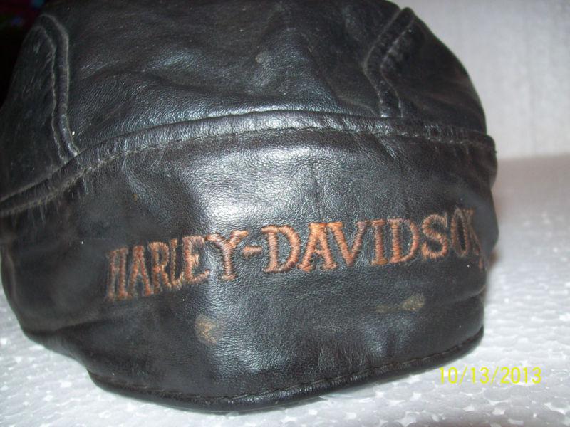 UP FOR AUCTION IS A VINTAGE HARLEY DAVIDSON LEATHER SKULL CAP. IT HAS A GREAT RIDE TO LIVE,LIVE TO RIDE PATCH ON THE BACK FLAP. THE LETTERING ON THE FRONT HAS FADED SOME,IT LOOKS BRIGHTER IN THE PICTURE. ONE SIZE. MADE IN USA. NO RIPS OR TEARS,JUST TYPICAL LEATHER WRINKLES. PURCHASED FROM A GENTLEMAN IN HIS LATE 60s WHO WORE IT "BACK IN THE DAY" AS HE TOLD ME. A GREAT CAP FOR YOUR RIDE. SEE PICTURES FOR MORE DETAILS. ANY QUESTIONS JUST ASK.