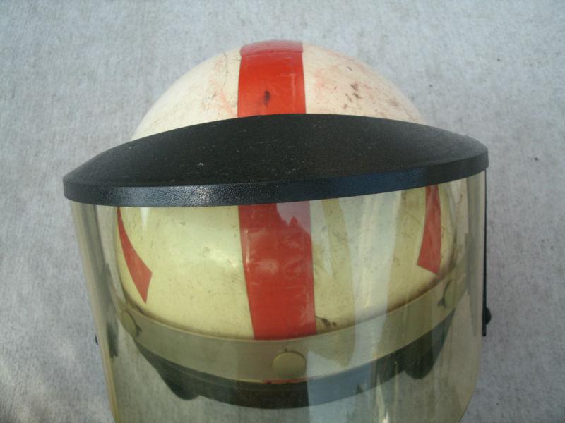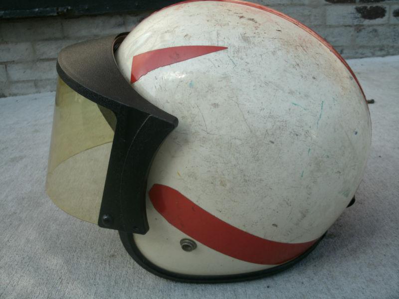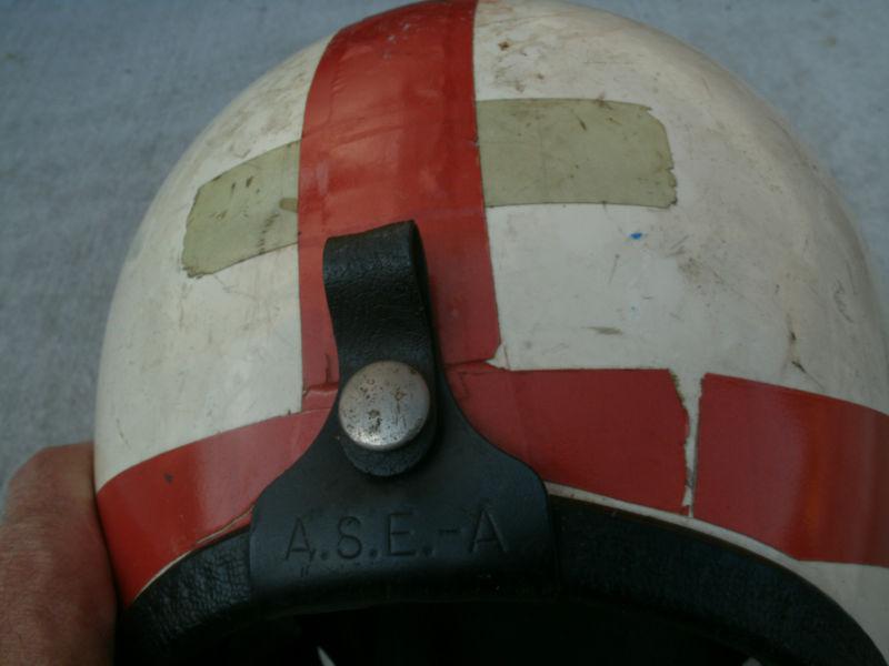 Recently acquired several different vintage helmets and am listing them all for sale here on Ebay. This helmet is probably the roughest of them all. I was not able to find the name of the maker on it anywhere. The only tag I see on it is one inside that just says AMA approved and has some patent numbers. Then on the back snap of the helmet the letters A.S.E.-A appear. I am thinking that someone added the orange stripes and that possibly there are other decals or markings underneath...but not sure...just a guess. I assume that there was foam under the cloth, but it has all deteriorated from age. The cloth is still there and decent, the straps are in good shape and the visor is nice as well. There are obviously lots of nicks and scraps to the helmet, as my pictures clearly show. Thanks for looking and feel free to ask any questions prior to bidding.