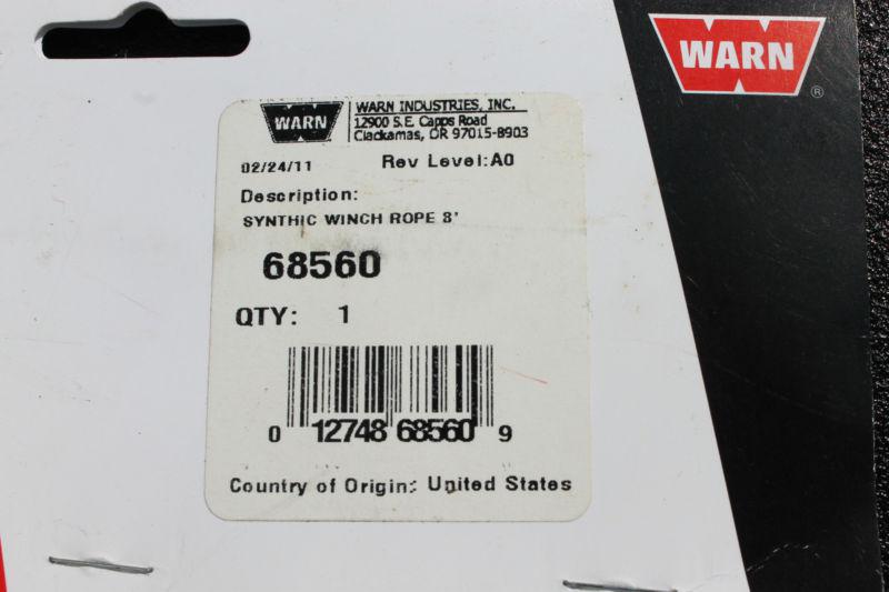 For Sale: (1) PN68560 SYNTHETIC WINCH ROPE FOR AN ATV PLOW. Overview of Warn Synthetic Winch Rope - 68560 8 ft. section of incredibly durable synthetic rope Perfect for use with plows Stands up to repeated sharp angle pulls like when lifting heavy plow blades Specs Length 8 ft. Type Winch Cable/Rope Units Each Weight 0.12 lbs Thanks and good luck!