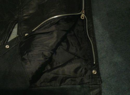 Like new Diamond Plate Buffalo Leather black chaps. Very thick & heavy chaps size med. 2 snaps at the bottom. Zipper goes all the way up. Back ties together and buckle style cinch belt in front. The front also has 1 flat pocket. Fully lined 100% polyester & 100% leather shell.