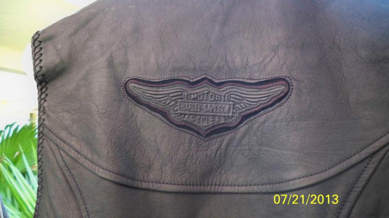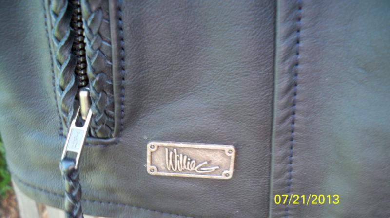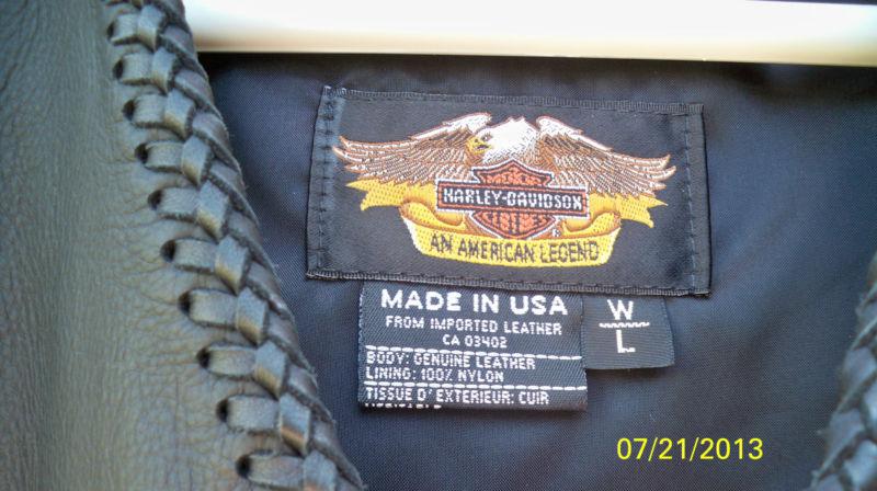 THIS IS A WOMENS LARGE HARLEY DAVIDSON WILLIE G VEST. BLACK LEATHER. MADE IN THE USA. HARDLY WORN GREAT CONDITION. MEASUREMENTS ARE 20 INCHES ARM PIT TO PIT, LENGTH IS 22 INCHES LONG. ACROSS THE BACK BOTTOM 21 INCHES WIDE.SHOULDER TO SHOULDER 16 INCHES. THESE RARELY COME UP FOR AUCTION SO DO NOT MISS OUT ON IT. THIS WAS HARDLY WORN. DISCONTINUED BY HD. THINK ABOUT SAVING SOME MONEY, THINK FALL AND WINTER IS RIGHT AROUND THE CORNER